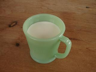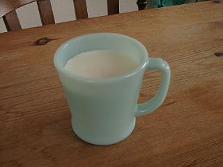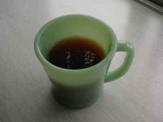 | ジェイドのマグカップ。ミルクの白がとても映えてきれい。 | 朝はコーヒー。 |