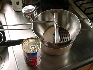 この間の日曜日に、たまたま見ていたフジテレビの 『あつあつボンジュール』 ( ミニ番組の中。8月29日のキッチンの大発明を参照)という番組でこの器具が紹介されていた。見たとたんに、あ〜これだ!と思い出した。何年か前にWOWOWでイタリア料理の番組があったのだが、そこで『SALVATORE』のシェフのSalvatore Cuomoさんがトマトソースを作るのに使っていたのだ。そのときは業務用の器具でイタリアでしか買えないだろうと思っていたが、フランスでは一般の家庭でも持っていて色々な野菜をゆでてそのまま濾してスープを作るのに使ってると言っていた。 名前がわからなかったので検索してみたら『ムーラン』といわれていることが判明した。そしてネットで買えるところもある。あちこち比べてみて購入することにした。 ムーランというとムーランルージュを思い出すがムーランは粉引き機のこと。 正式にはMoulin a legumes(ムーラン・ア・レギューム) ・・・Moulin(挽く) a(を) legumes(野菜) イタリア語だと passaverdura (パッサヴェルドゥラ) ・・・passa(通す、濾す) verdura(野菜) 届いて、早速使ってみた。まずはトマトソース。写真のようにおなべに重ねてのせる。そしてトマトの水煮缶を開け、ハンドルをまわすと、トマトがつぶされて下の鍋に落ちていく。3種類の大きさの目がついているのでより滑らかにしたいときは小さい目を使う。 今まではトマトを鍋に入れて手でぎゅっと握ってつぶしていた。それでも少し煮込んでいると形が崩れてくるので大丈夫なのだが、ムーランを使うととても簡単。それに手でつぶすとときどき指の間からトマトジュースが飛び出してびっくり!ということもあるのでかなりよさそうだ。 形はなくなっているのでさっと煮てペンネ・アラビアータにしてみた。あまり煮込まないのでフレッシュな感じでおいしい。 あつあつボンジュールでやっていた野菜スープもとてもおいしそうだったので今度作ってみよう。 ただ、想像していたよりは大きめでだったのでミニでもよかったかも。4人家族だったら小でちょうどいいかもしれない。 |