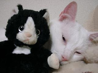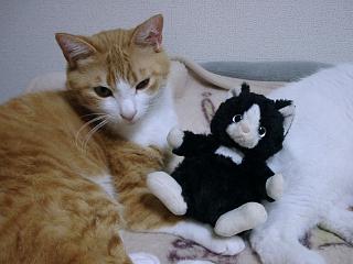 | ぬいぐるみと一緒に撮ろうとしたのに、ソファの後ろに隠れるミック。 | 友達に借りたぬいぐるみと、もうすっかり兄妹のように寝るトト。 | 妹のように面倒を見るアリー。 |