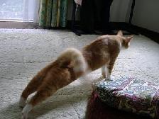 | 今日は暑くって、ぐったり、寝てばかりのミックでした。 | トトも、でれっと寝ています。太っているからよけいに暑そう。 | ウ〜〜ンと、伸びをするアリー。 |