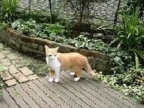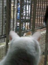 | 今日もお気に入りの場所で伸びて寝ているミック。 | お散歩に行ってしまったアリーを悲しそうに呼び戻しているトト。小さく写っているのはアリーのパパ(多分)です。 | 窓を開けたときに網戸を閉め忘れたら、外に出てしまったアリー。アリーのパパとお散歩をしてきたらしい。 |