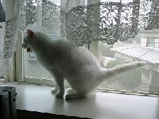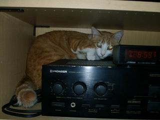 | 台所のミック。ちょっと眠たそう。 | 窓辺で何か言っているトト。 | ステレオのアンプの後ろに入り込んだアリー。なぜ、後ろめたい顔を? |