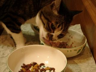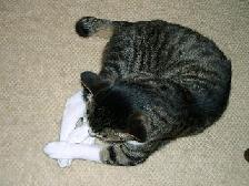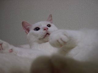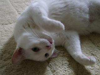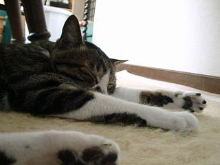 | 大好物のマグロを食べて満足のミック。ミックだけの特別メニューです。 | トトの手。貸してほしい方には貸し出しいたします。役に立つかどうかは保証しかねますが・・・ | 香箱を作って眠るアリー。猫らしくなってきた。 |