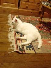 | 台所でトトとアリーを警戒しているミック。居間にはトトとアリーが来ています。 | 居間のキリムで一休みのトト。 | テーブルのうえの新聞に座るアリー。何を気にしているのでしょう?この耳は? |