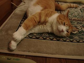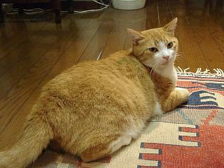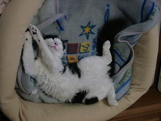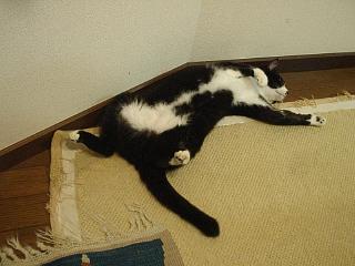 もう一枚、サラ。壁際で変なポーズで寝るのが好き。カーペットの淵で爪とぎをするのも好き。だからうちのカーペットはボロボロ。 |