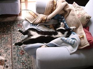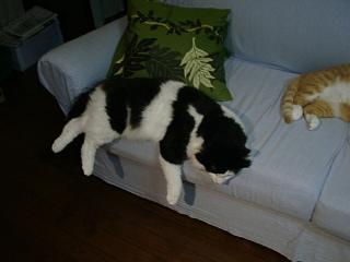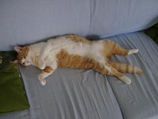 サラはまた一層変。伸び切って寝ていますしかも仰向け。これは兄妹の特徴なのか。上の写真はソファから足がはみ出しているのにぐっすりお休み中。下のはまっすぐに伸びて寝ています。何でだろうね〜 |