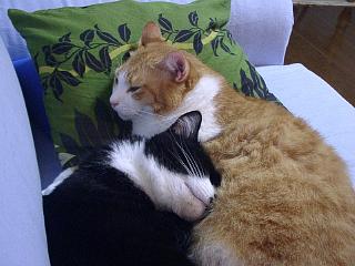 | アリーは読書が好き。今日は漫画だけど、『動物のお医者さん」おもしろいよね。二階堂が好き。と言ってました。アリーは関西弁はしゃべらないけど。。 | オスカー君ソファから落ちそう。ま、胴体の重量から比べたら猫の脚ってほんのわずかの比率だろうけど。 | 少し涼しくなってきた最近くっついて寝ていたりする。猛暑のときは各自一部屋ずつにわかれてすごしていたのにね。意外と仲良しの姉妹(本当は他人)です。 |