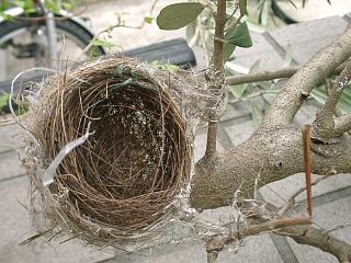 オリーブの枝に作ってあった鳥の巣、(なんてタイムリー!)です。 23日にオリーブの木を剪定したのですが、かなり大胆に枝をのこぎりで切りました。ちょうど切った上に鳥の巣が付いていました。ヒナも卵もなかったのでよかった。雨風が直撃するのであんまり住み心地はよくなさそう。だからすぐによそへ行ったのかなと思います。もしも住んでいる鳥さんがいたらごめんね。 とても器用に箒の繊維のようなものでカゴのように形を作って、糸やビニールで枝に巻きつけて落ちないように固定してありました。少しずつ運んできて作ったんでしょうね。鳥ってすごいです。 |