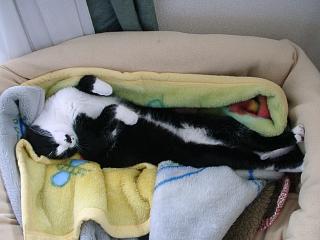 | アリーは2匹と比べればまだ普通の猫らしい寝かた。でも暖かくなると前足を伸ばすのは普通なのかな。気持ちよさそうに寝ています。 |
