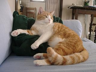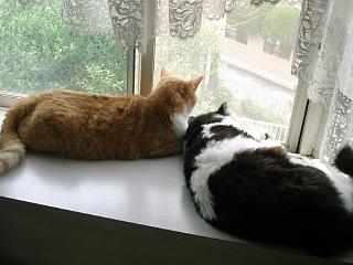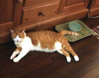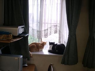 | 最近はさすがに暑い。でもアリーちゃん、女の子なのにそんな格好で・・・いいのかな。 | 出窓で外を眺めるアリーとオスカー。ちょっとなかよし風。まだまだ子供のオスカー君、ときどきアリーにはたかれています。 | 本棚を段々に並べておいてあります。猫たちにはちょうどいい遊び場。サラはここがお気に入りで寝ていたりします。 |