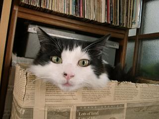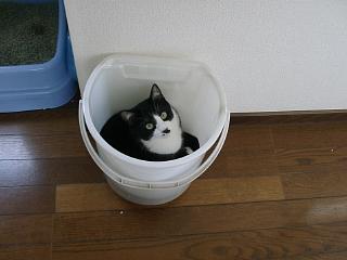 | ソファでくつろぎ中のアリー。とっても偉そう。 | 読んだ新聞を入れている箱に入っているオスカー。最近はここがお気に入りで気がつくと入って寝ている。狭いんですけどね。 | サラは洗濯もののバケツに入っています。これ狭いというか小さいのですが丸い形になって入っています。 |