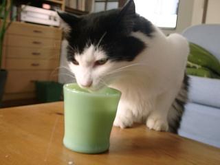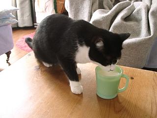 | 窓から外を眺めるふたり。オリーブの花がちょうど咲いているので鳥やハチが飛んできます。 | ミルクを飲むオスカー。オスカーはこぼしながら飲みます。困ります。あんまり甘やかすとよくないんだけど、ちょっとだけ甘やかしてあげる。 | サラもミルクが好き。 |