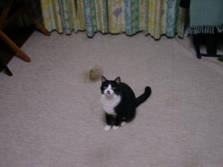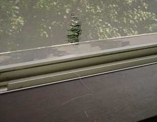 | いつもソファにいるアリーですが、ときどき暑くなるのか床に座っています。水辺でひと休み? | オスカーのお仕事!夏は網戸に虫が止まっていることが多いです。そうすると、オスカー君、おかしな声を出しながら虫を捕まえようとします。気付いて見に行くと、網戸はこういう状態に・・・・もう2枚張り替えました。網戸の張替えは上達しましたが、困るんですよね〜 (>_<) | ボールを追いかけ中のサラちゃん。毎日運動しています。とっくに壊れた猫のおもちゃの棒の先にゴムひもを結んでその先にボアのボールをつけた特製の通称「猫釣り」で夢中になって遊びます。動きが速すぎていい写真が撮れません。 |