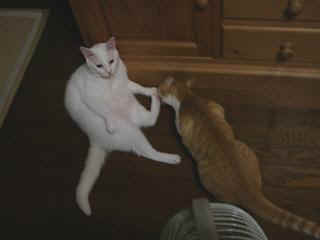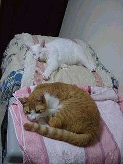 | ソファで爪とぎ!!『こらっ、ミック!ダメ〜〜ッ!!やめなさいっ!!』 | トトの足をなめるアリー。トトは、偉そうなポーズ。 『ちょうどそこが痒かったんだよ〜』 | また暑さが復活。ずうっとくっついて寝てたけど、さすがに暑くて離れて寝ているようだ。 |