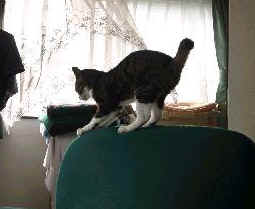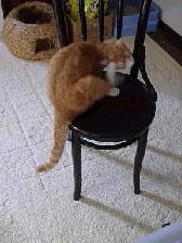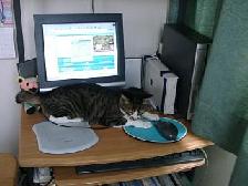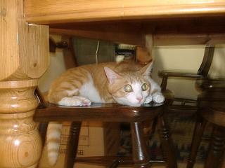 | ホームページチェック中のミック。 | 背中の毛づくろいをするトト。 | テーブルの下の椅子から、何かを狙うアリー。 | |
