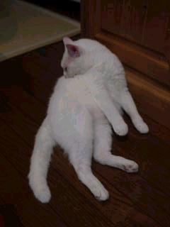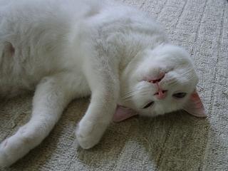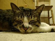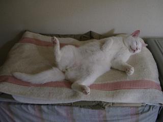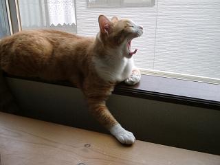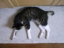 | 今日の暑さにまいったミック。なぜここに?この真上にはファンが回っているのです。 | トトもまいっています。女の子でなくてよかったね。このポーズ。 | 耳を掻くアリー。猫って、後ろ足で耳を掻くけど何故なのでしょう。前足のほうが便利そうなのに。 | |