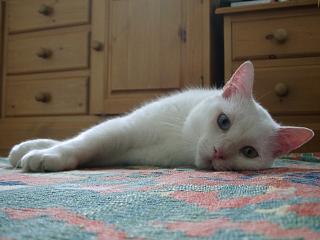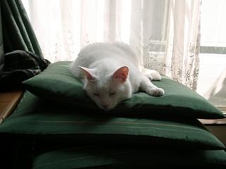 | 今日も台所のマットで寝るミック。 | 座布団を重ねて置いてある上で寝るトト。ふかふかなところが大好き。 | ソファの後ろに隠れるアリーのアップ。捕まえられると思って緊張感いっぱい。 | |
