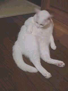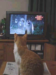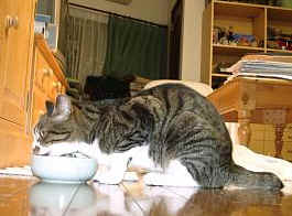 | 水を飲むミック。すごく几帳面なポーズがおもしろい。でも、猫って、水が飲みにくそう。 | 胸の毛繕いをするトト。鼻にしわを寄せて、一生懸命なめている。すごく太って見えますが、実際ふとってます。 | うちではただひとり、テレビに関心を示すアリーが、お気に入りの番組『どうぶつ奇想天外』を見ているところ |