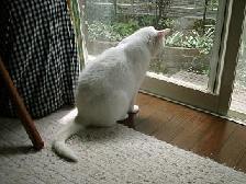 | 窓辺で、ボーっと外を見ていたミック。『ベロをしまうのを忘れているよっ!!』 | まどから庭を眺めるトト。ときどき、虫やトカゲ、よその猫が通るので、結構面白いようだ。 | 目を見開いて何かを見つめるアリー。その視線の先にはミック。追いかけようと、狙っているのだ。まったく困ったいたずらアリーちゃん。 |