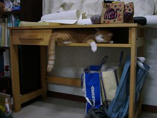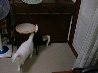 | 7日、早速、長野のうちの探検。オルガンのペダルの隙間から中に入ってみる。アリーは軽く入れると思うが、トトも入れたのでした。 | 9日、網戸越しににらみ合い唸るパパネコとミック。パパネコは網戸もものともせず飛び掛ろうとしています。かなりの迫力。 | 15日、アリーさん、やっぱり、狭いところに入るのが好き。この幅にジャンプして入れるっていうのがすごいような気がする。 |