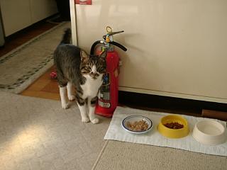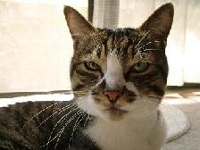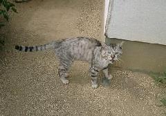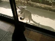 | 27日、うちの庭を散歩中のパパネコ。『ここは俺のなわばりなんだからな。』14歳のミックにはちょっと手ごわすぎる相手でした。 | 27日、すっかり元気(?)になったミック。うちの中では、とっても偉そう。(実際一番えらい猫)でも、外へはでられません。 | |