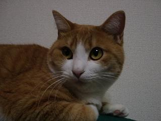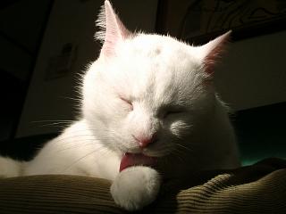 | ひなたで溶けそうになっているミック。晴れた日の午前中はお日様が一杯あたって暖かい。 | オットの足の上で前足のお手入れ中のトト。ちょどう陽があたってきもちよさそう。 | おもしろい目のアリー。また怒られると思っているのかな? |