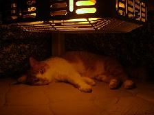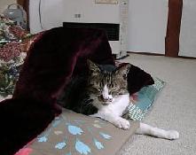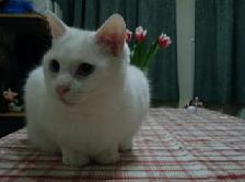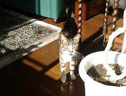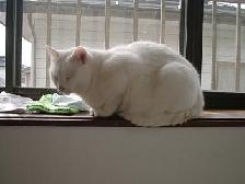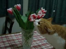 | クリスマスイブのミック。ストーブの前でとけそう。いつもよりちょっと多目にカツオ)を食べたね。 | クリスマスイブのトト。お料理を食べてきれいになったテーブルで、ちょっとひとやすみ。 | 同じくアリー。どういうわけか、アリーは花の匂いを嗅いでみる。ほっておくと、食べようとする。 |