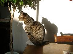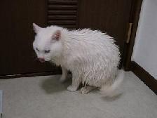| ミックとミックの影。午後の、少なくなったひなたで日光浴中。 | シャンプーのあと、ドライヤーで乾かされているトト。シャンプーはやっぱり好きではないみたいで、バスルーム中逃げ回っていました。 | シャンプーのあと、ドライヤーで乾かしているときのアリー。なのですが、ドライヤーが大嫌い、なので、必死に逃げようとして、近づけるとねこパンチを出してきます。 |