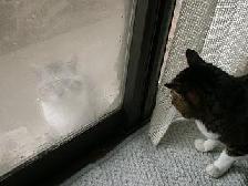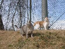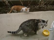 | 仇敵パパネコに再会のミック。今回はさすがに外へは出しません。会うたびにパパネコの大きさにはびっくり。 | ミーちゃんとチャット君(勝手に命名)近くに住んでいるチャトラがいると聞いていたが、ミーちゃんを気に入っているらしくついてくるので、一緒に散歩した。 | ごはんを食べるパパネコとそれを見つめるチャット君。チャット君は好奇心旺盛な男の子。 |