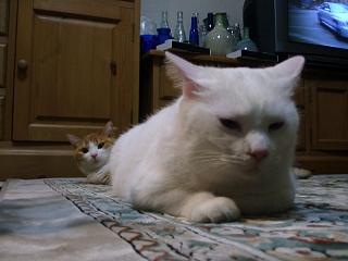 | ご飯を食べるミック。真俯瞰。 | ホットカーペットでぬくぬくのトト。うしろにはアリー。 | テレビの上でなぜか伏せているアリー。暖かいのかも? |