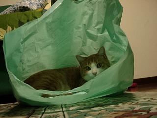 ジャスコの袋に入ってみました。ビニールやプラスチックの袋は、入ってみるのも丸めてボールにして遊ぶのも大好きなアリー。 |