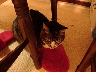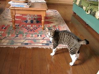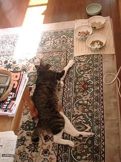 | まだまだ寒い今日。ストーブの前ででれでれお休みのミック。この後熱くなりすぎて伸びてました。 | アリーが遊んでいたメジャーで遊ぼうかな〜と思案中のトト。ちょっとじゃれてみたけどイマイチだったみたいです。 | テーブルの上においてあったメジャーを引っ張って遊んでいたアリー 。最後にはかならず水の中に入れておぼれさせます。不思議だけどアヒルのおもちゃなんかもよく水につかっています。 |