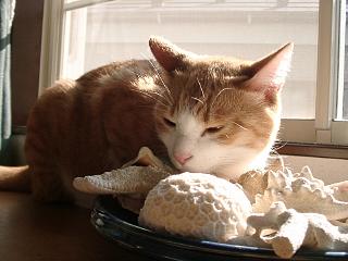 | 窓際のサイドボードの上に貝殻やサンゴを入れたお皿を載せて(飾って)あるのだけれど、ときどきトトは、そこからサンゴや貝を落として遊ぶ。 | お皿から器用にサンゴを取り出しているところ。そのまま左前足(左手)を右に動かして・・・・ |
