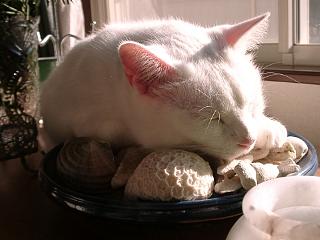| とろけるミック。とてもお天気のいいある日のこと。もうこのうえなく幸せという感じ。 | なぜだかほんとにトトはこのお皿に乗っかって寝るのが好き。 | トトもすなるお昼寝をしてみんとて、アリーもお皿に顔を乗せてみた。でこぼこしてあんまり寝心地はよくない。なんでこんなとこでぐっすり寝られるんだろう。トトってやっぱり変な猫。 |