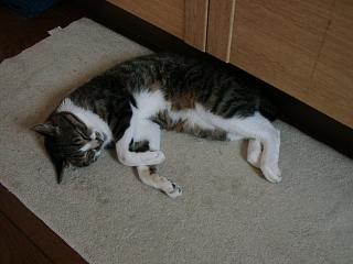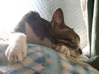 | お昼寝のミック。最近やせてきて肩の骨が鋭く見える。でも眠っている猫は幸せそうに見える。 | トトも寝ている。眉間にしわを寄せて寝るのはいつもと同じ。 |