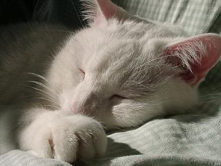 | スリッパに座っているミック。ボアなのでふかふかで暖かいのかすっぽり乗っかっています。わたしが脱いだ形のままが恥ずかしいのですが、ミックがあまりにかわいくてついとってしまいました。 | 窓際の陽だまりでまどろむトト。下から見上げてみました。後ろに写っているのは観葉植物とカーテンです。お日様ぽかぽかで気持ちよさそう。 |
