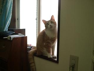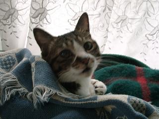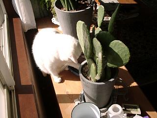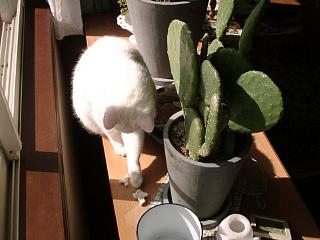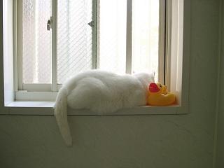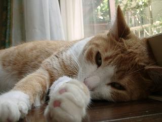 | 今日はポカポカ陽気。やっと春らしくいいお天気なので猫たちは日向でお昼寝しているけれど、暑くなりすぎてちょっと日陰に移動。伸びているミックです。 | 窓辺で日光浴のトト。暖かくってホントに気持ちがいいよね。でも 外は花粉がとんでいてすごい。車は黄色になっています。右下の茶色い小さなものはアリーです。そこに近づいていったのが右の写真。 | 西側の窓の隅っこで日光浴のアリー。レースのカーテンにもぐっていたのでちょっと直したら花嫁さんみたいになった。さすがに女の子。かわいいでしょ。 |