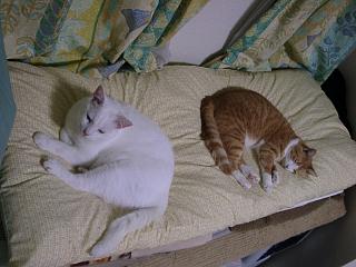 | 昨日の写真ですが、梅雨時とは思えない暑さに参っているミック。台所のマットのうえでごろごろ。1階のほうが涼しいけれど、ママの側がいいのか暑い2階にいる。 | こちらは1階のトトとアリー。さすがに1階も暑くてだらだらとしている。毎年思うけど毛皮を着てるんですもの、暑いよね。 |